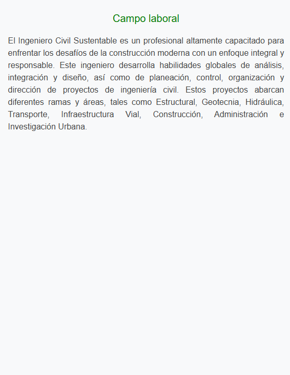 La formación académica de los futuros Ingenieros Civiles Sustentables les permitirá integrarse con facilidad a diversos ambientes laborales, públicos y privados, relacionados con la industria de la construcción, en las áreas de planeación, diseño, construcción, administración, operación y conservación de proyectos de infraestructura y beneficio social; y podrán ejercer actividades empresariales y de consultoría, así como de investigación y docencia.