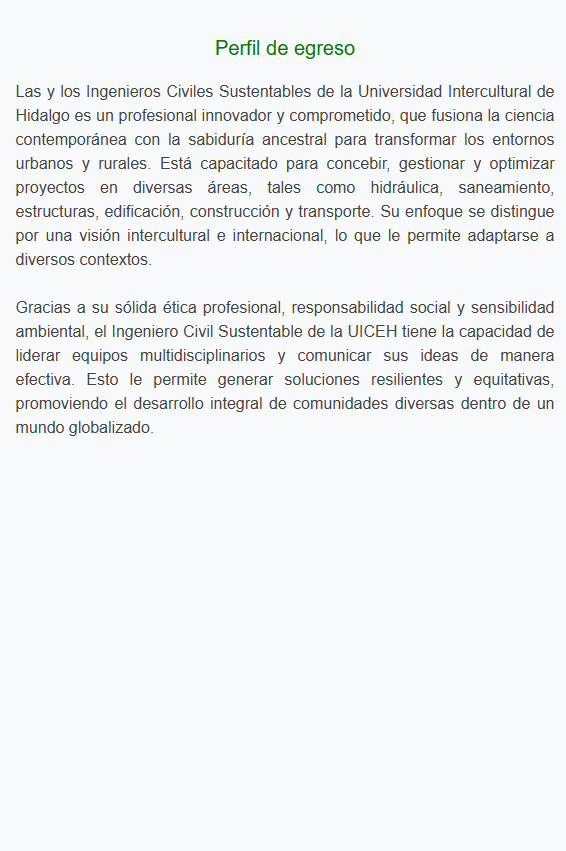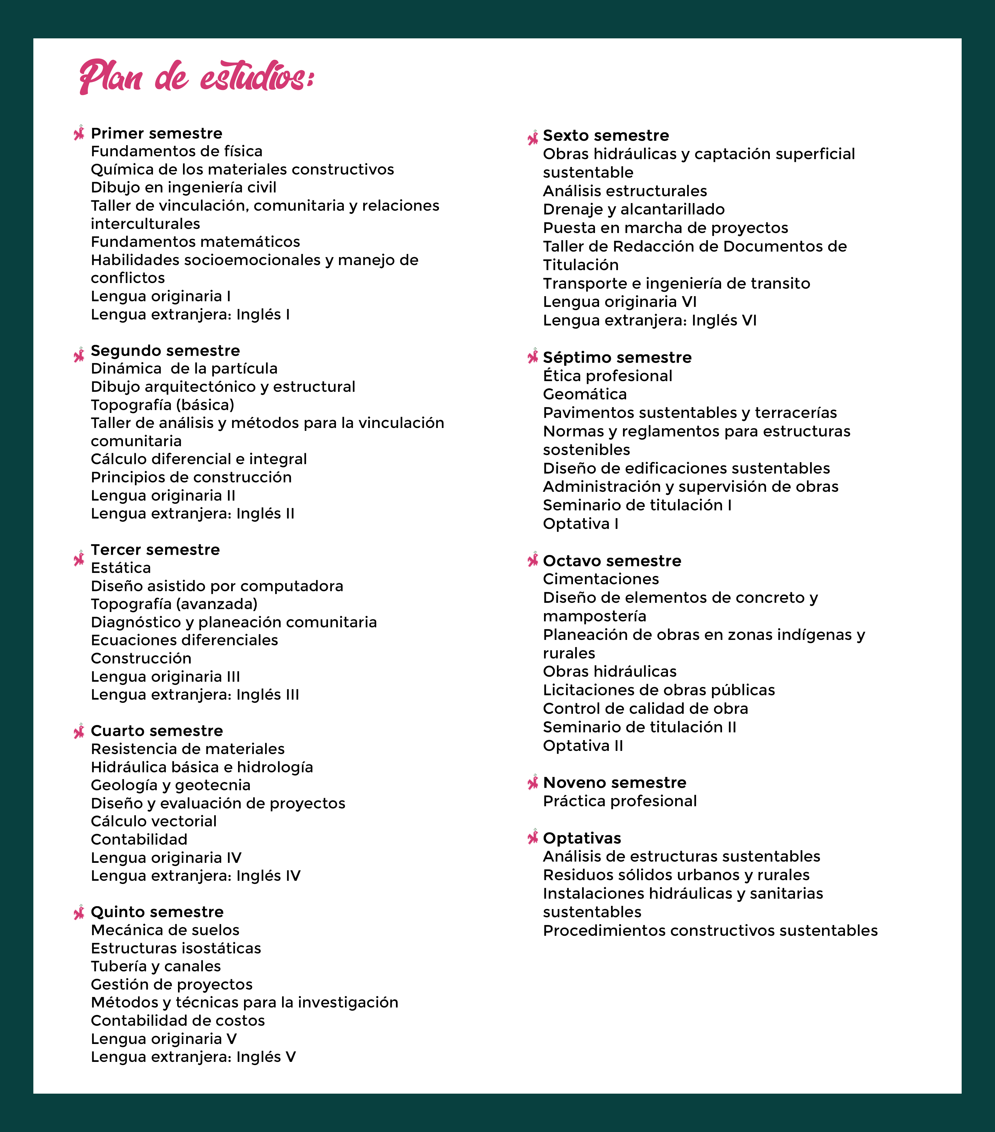 Formar profesionistas en Ingeniería Civil Sustentable capaces de integrar conocimientos científicos modernos y saberes ancestrales para planear, diseñar, construir, operar, evaluar y rehabilitar proyectos de infraestructura de obra pública y privada en áreas tales como hidráulica, sanitaria, estructural, edificación, construcción y transporte terrestre. Los futuros profesionistas atenderán las necesidades de los pueblos originarios y las comunidades rurales, desarrollando una visión internacional que les permita competir y colaborar en escenarios globales. Al adoptar una perspectiva intercultural que respete y valore la diversidad de conocimientos, y fundamentados en valores éticos y en la responsabilidad social, promoverán soluciones integrales que impulsen un desarrollo resiliente, equitativo y sustentable en un mundo interconectado.